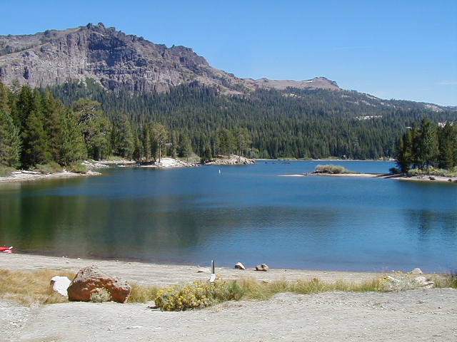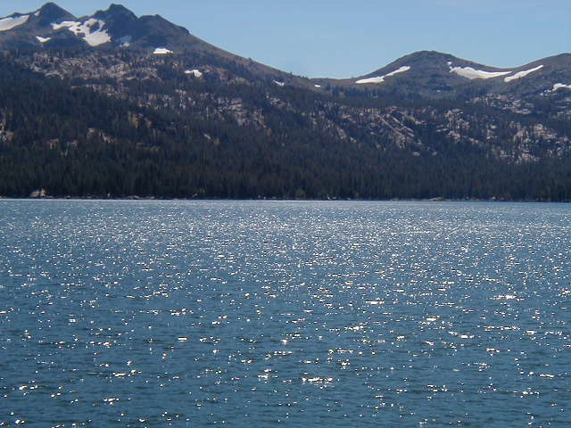 I went by Caples Lake and stopped at the Kirkwood Inn for a vegi-burger with a ton of french fries. I talked with two older guys who were driving back to Oklahoma City from the SF Bay Area, where they had attended a family reunion. It was interesting to ask about their driving route and sharing my biking route. We were all long distance travellers of one kind or another. Here is Caples lake, one last time.